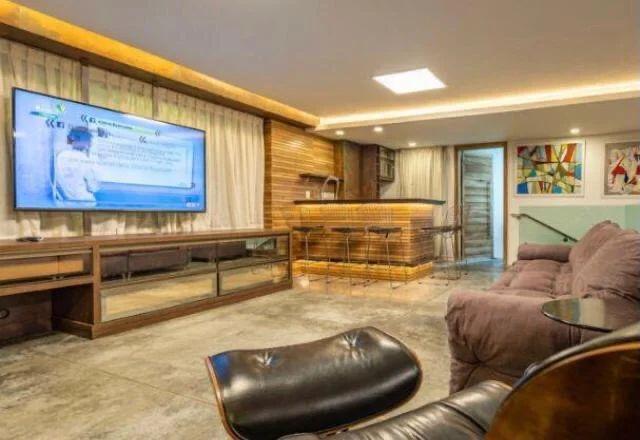 Sala de TV/Som: de 40 m2 com cozinha gourmet, fogão 2 bocas de vidro, armários, pia com torneira gourmet, porta vinhos, geladeira, micro-ondas, bar com iluminação de led. Varanda em frente a sala de TV/Som de 50 m2 com vista para o mar e jardim lateral de 25m2.