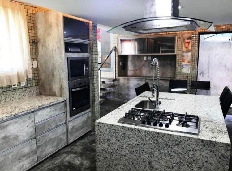 Copa/Cozinha: de 40 m2 com uma ilha toda em mármore (ver cor), composta de uma mesa de vidro embutida na ilha com 6 lugares, pia com torneira gourmet, cooktop. Armários embutidos, dispensa, cristaleira, pia no balcão com torneira gourmet, torre com forno e micro-ondas, geladeira e freezer.