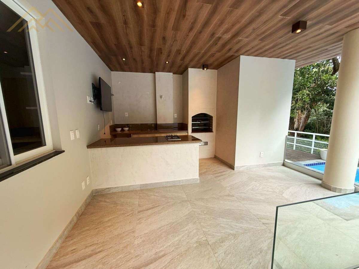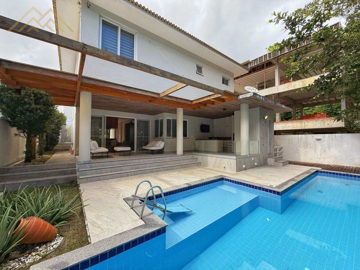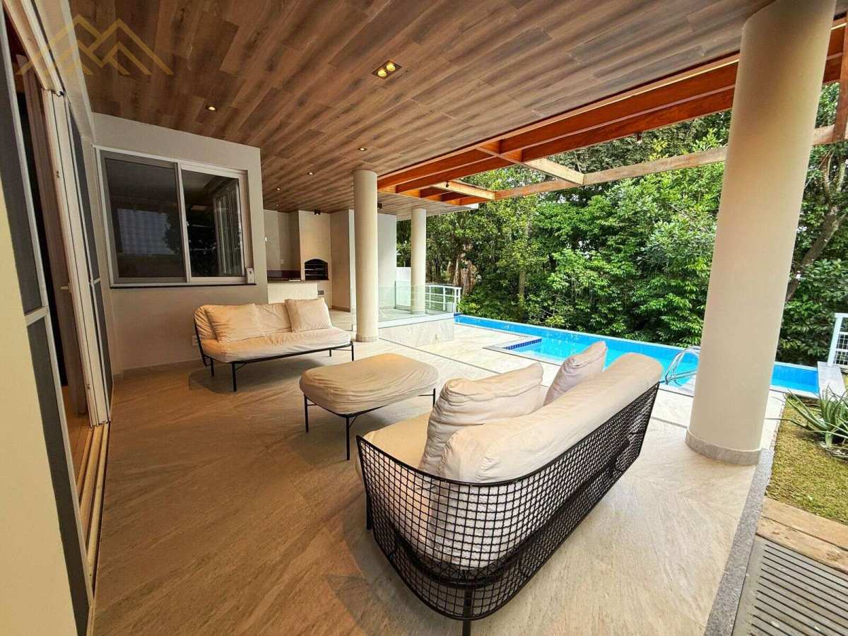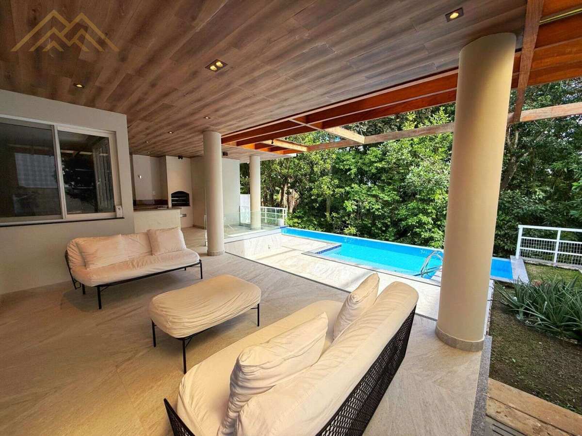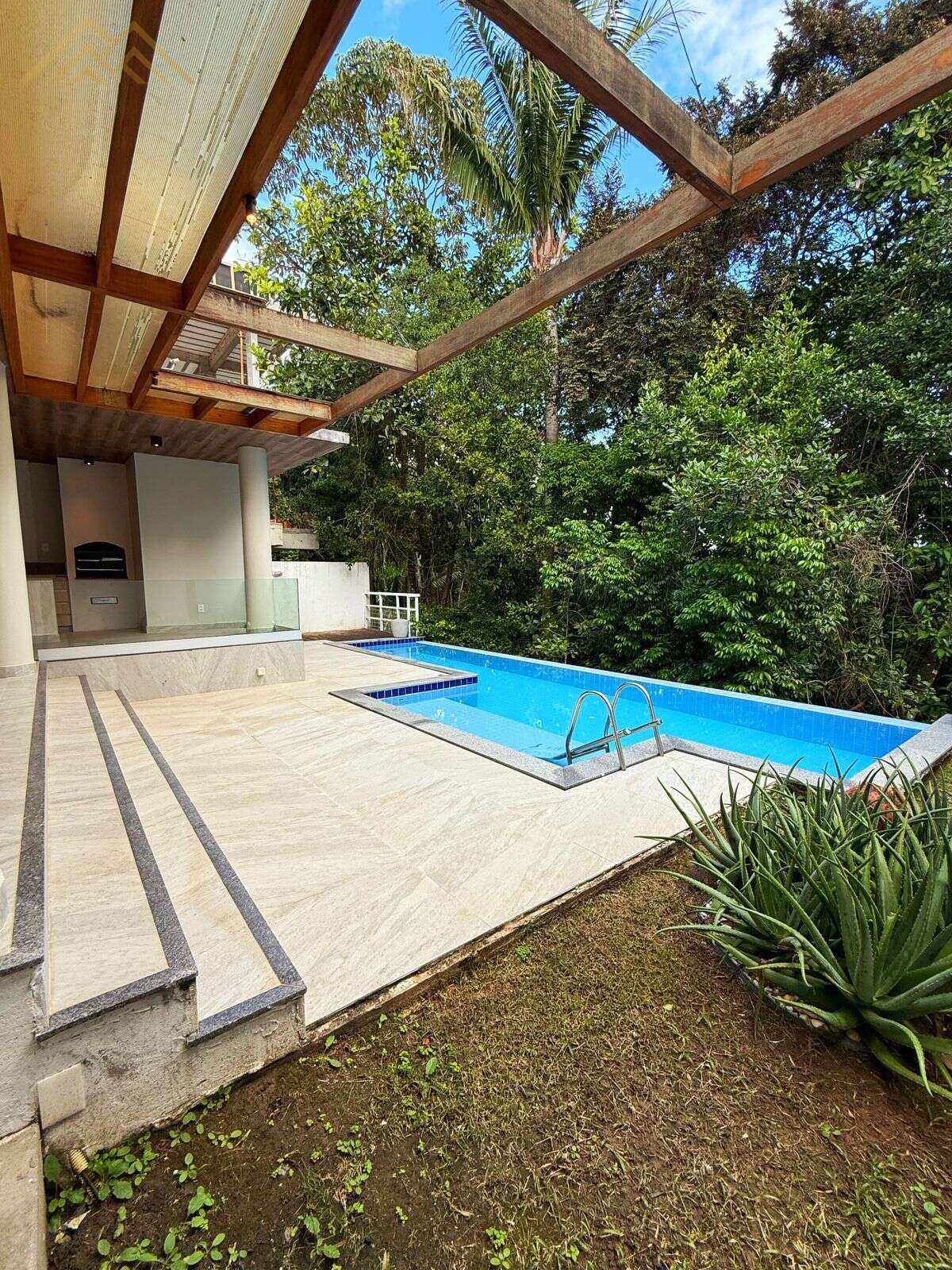 Área externa com pergolado e piscina de 12 m com borda infinita