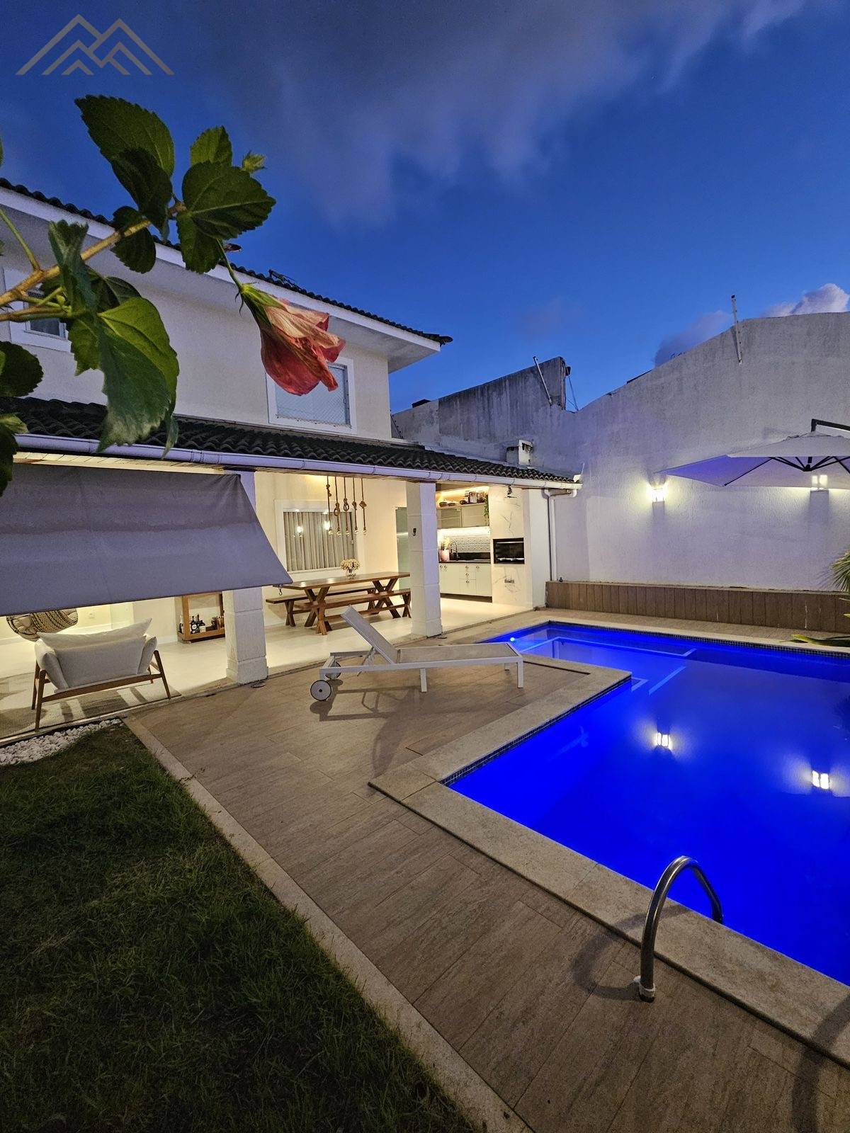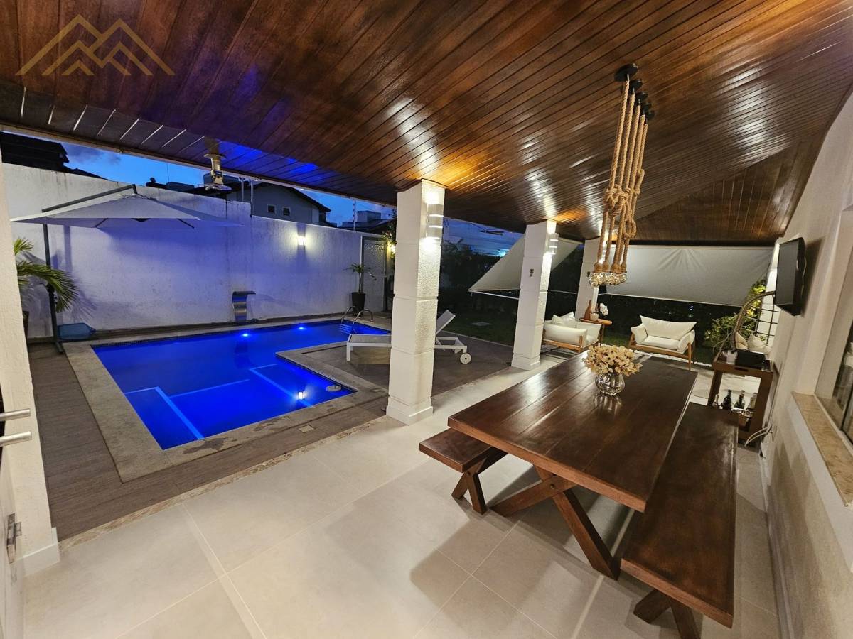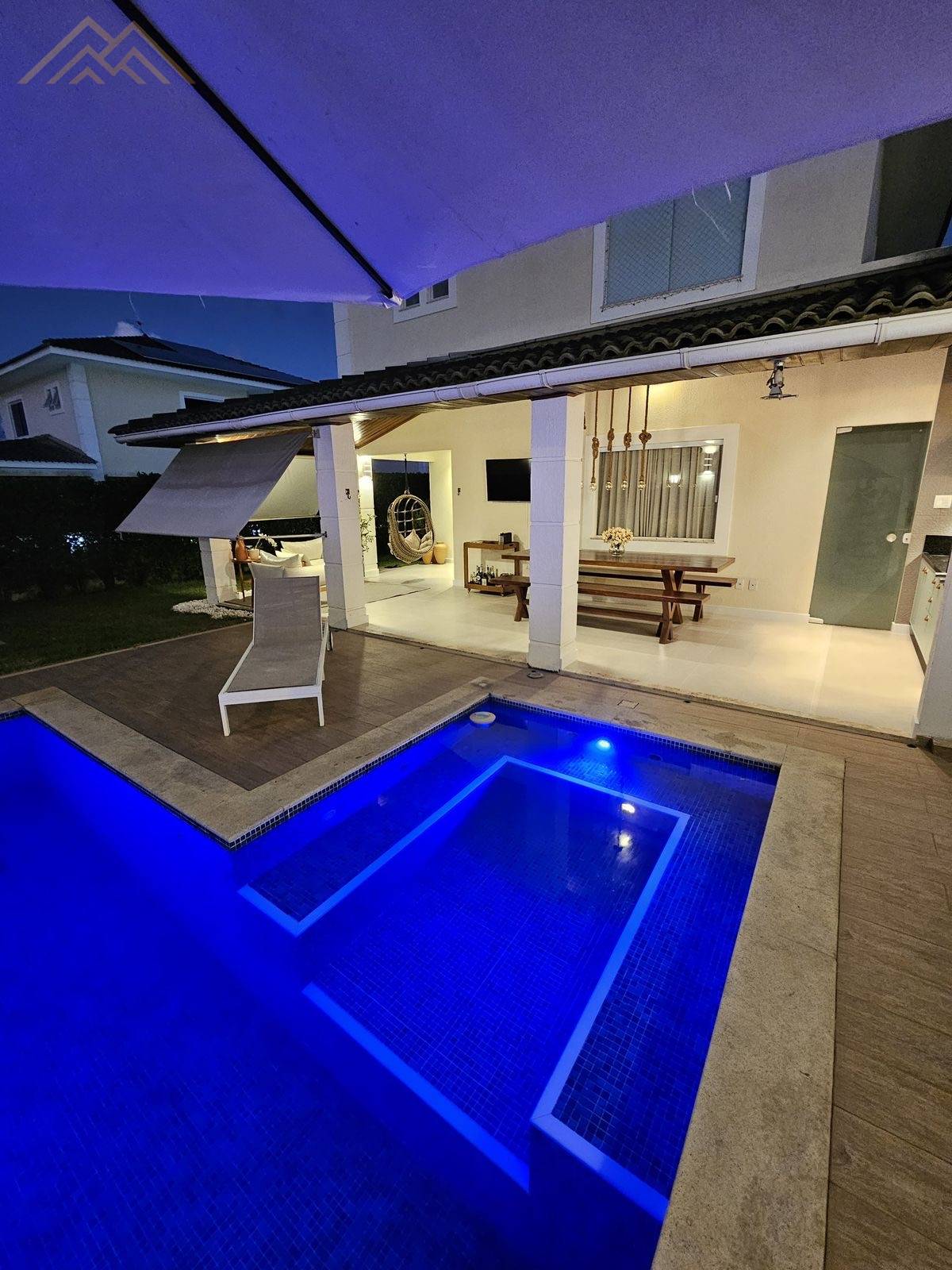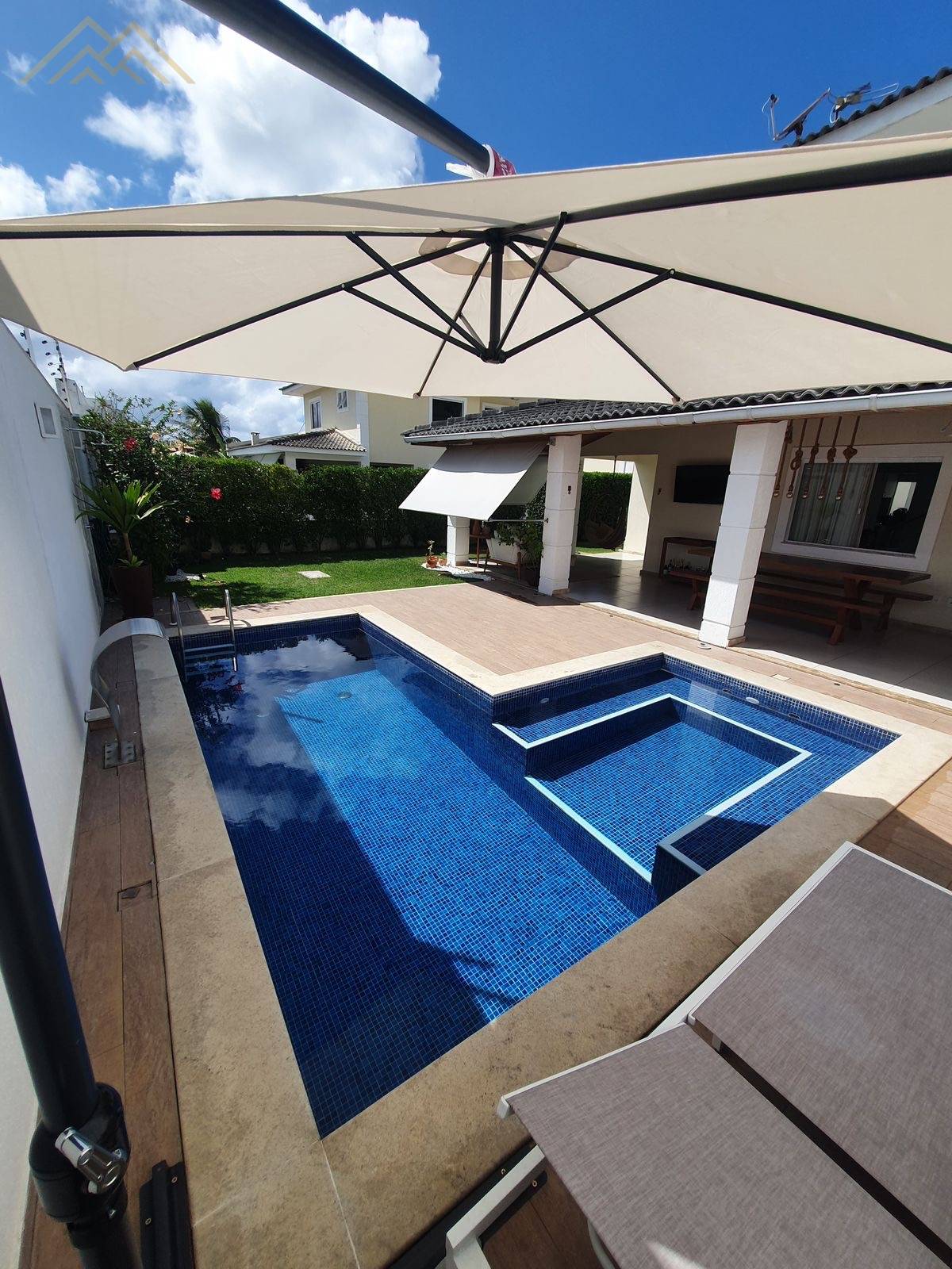 - Piscina de alvenaria em L, com hidromassagem, deck, cascata, iluminação e ombrelone lateral móvel;