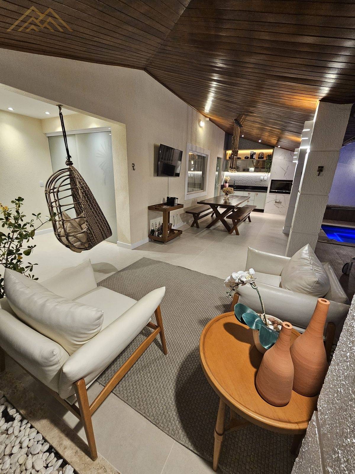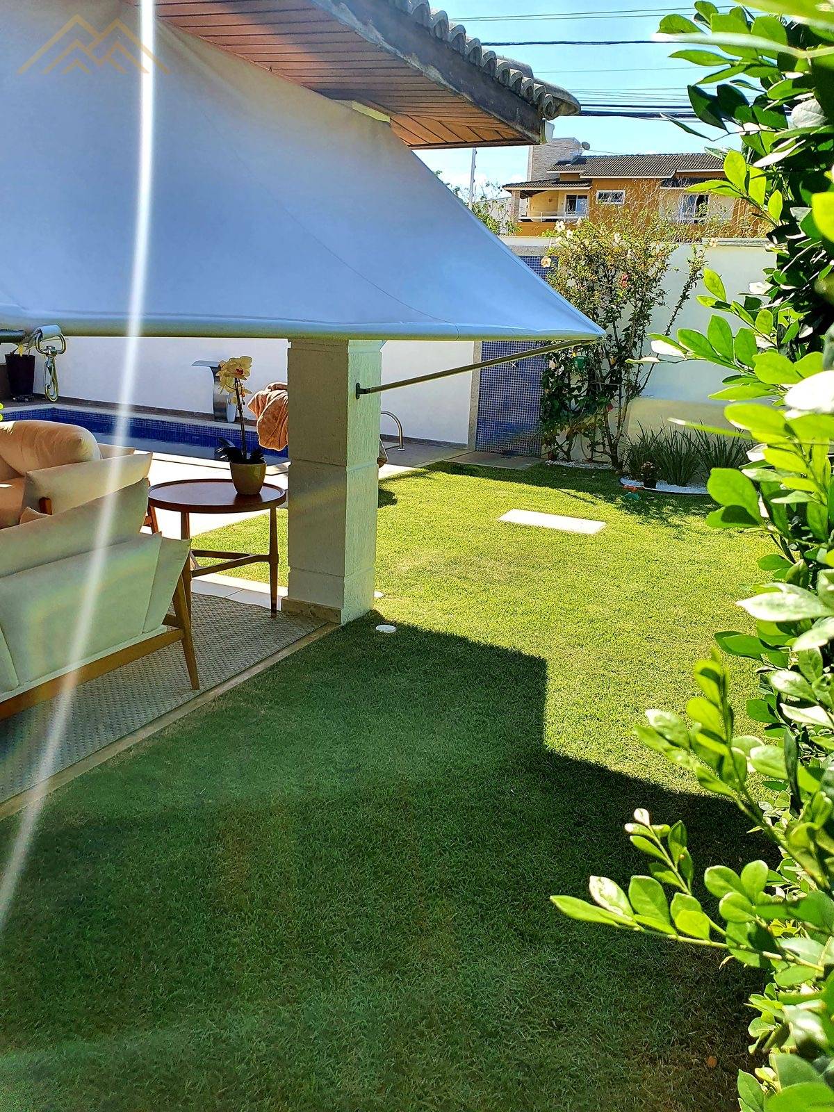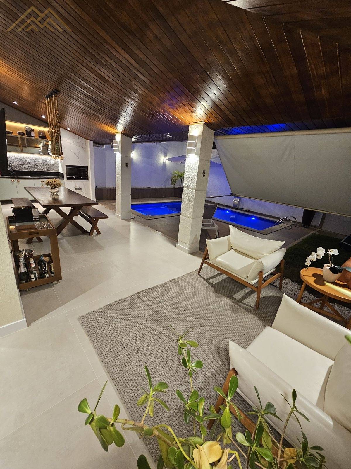 - Piscina de alvenaria em L, com hidromassagem, deck, cascata, iluminação e ombrelone lateral móvel;